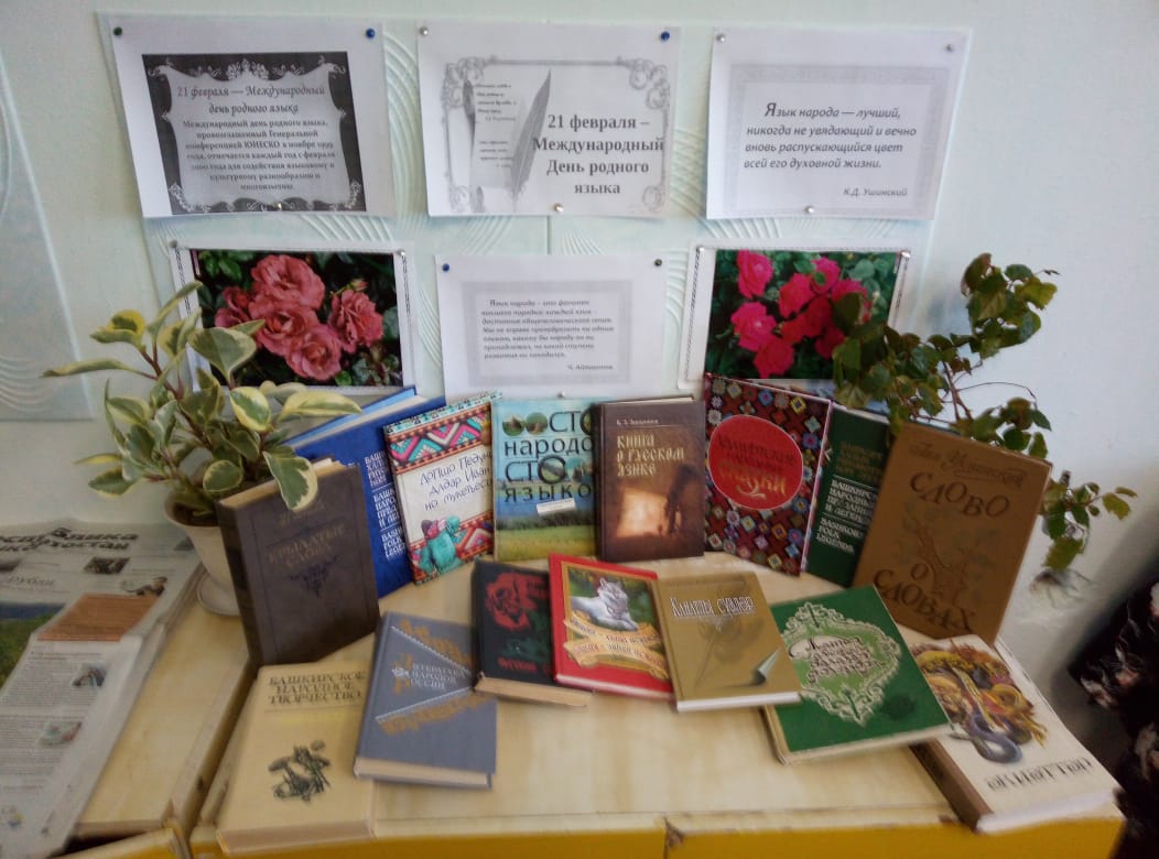 К "Международному Дню родного языка" в библиотеке школы было организовано книжная выставка. Где были представлены лучшие книги о родном языке. Это народные сказки на русском, башкирском и удмуртдском языке. Пословицы и поговорки.