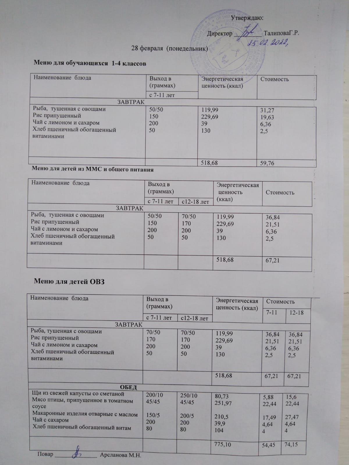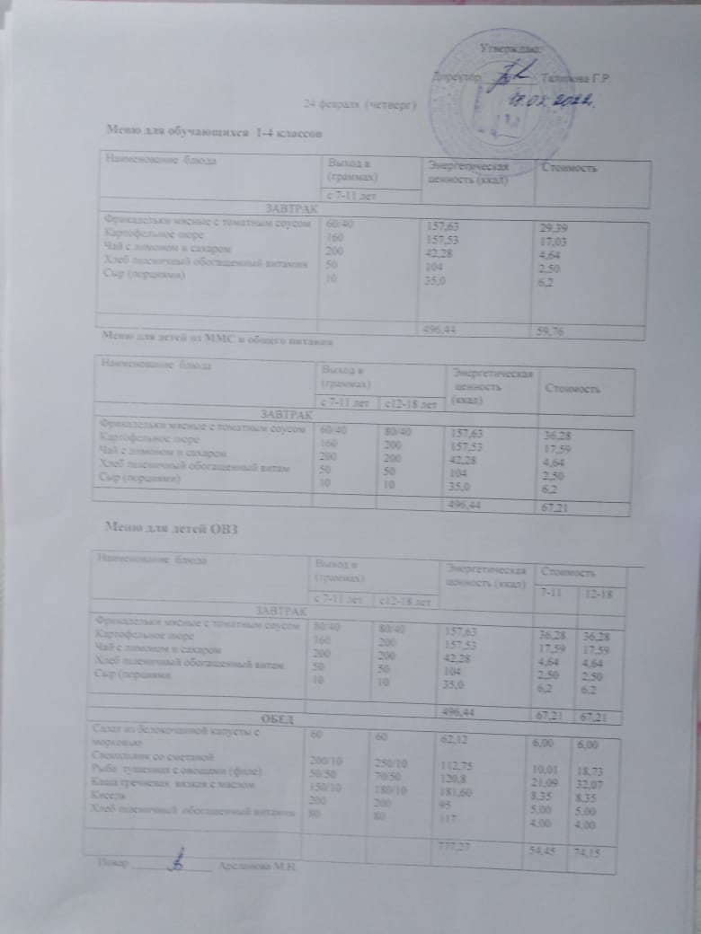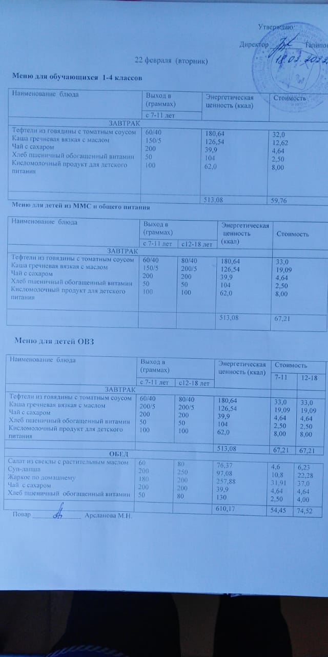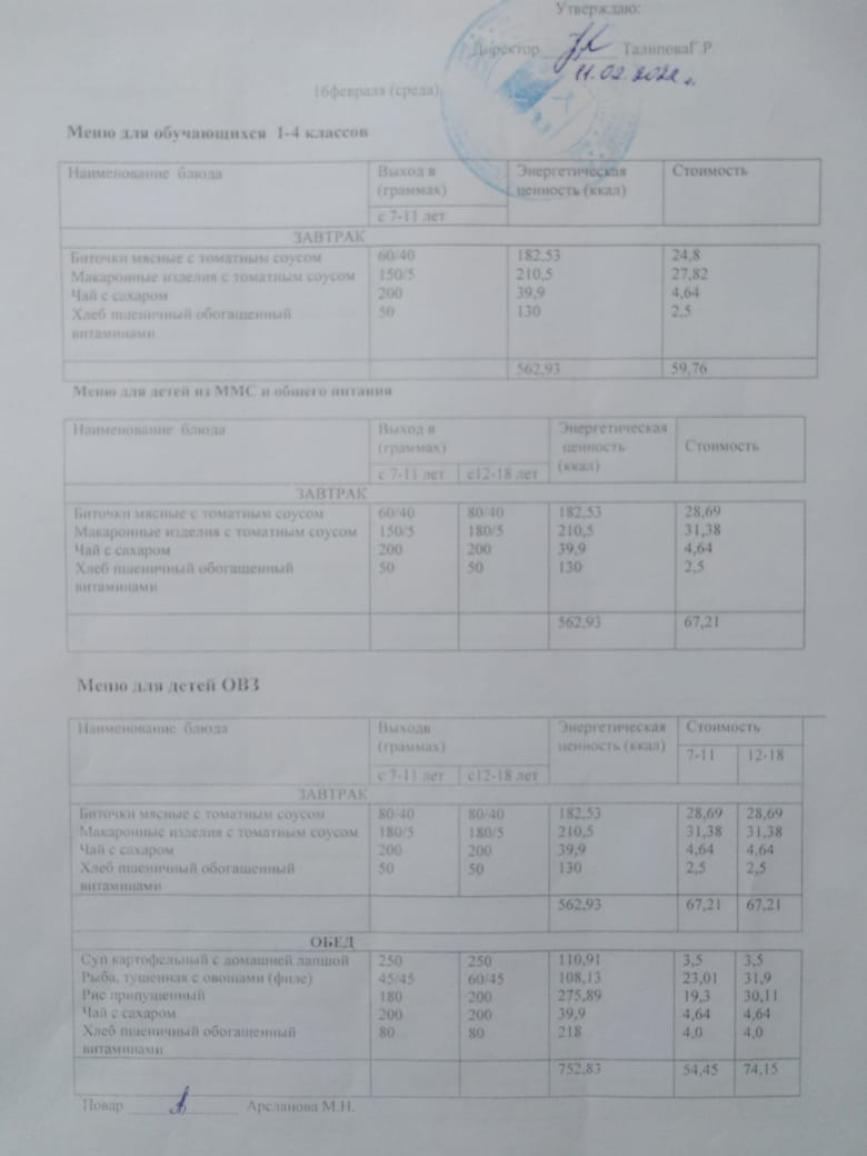 Стоимость школьного питания