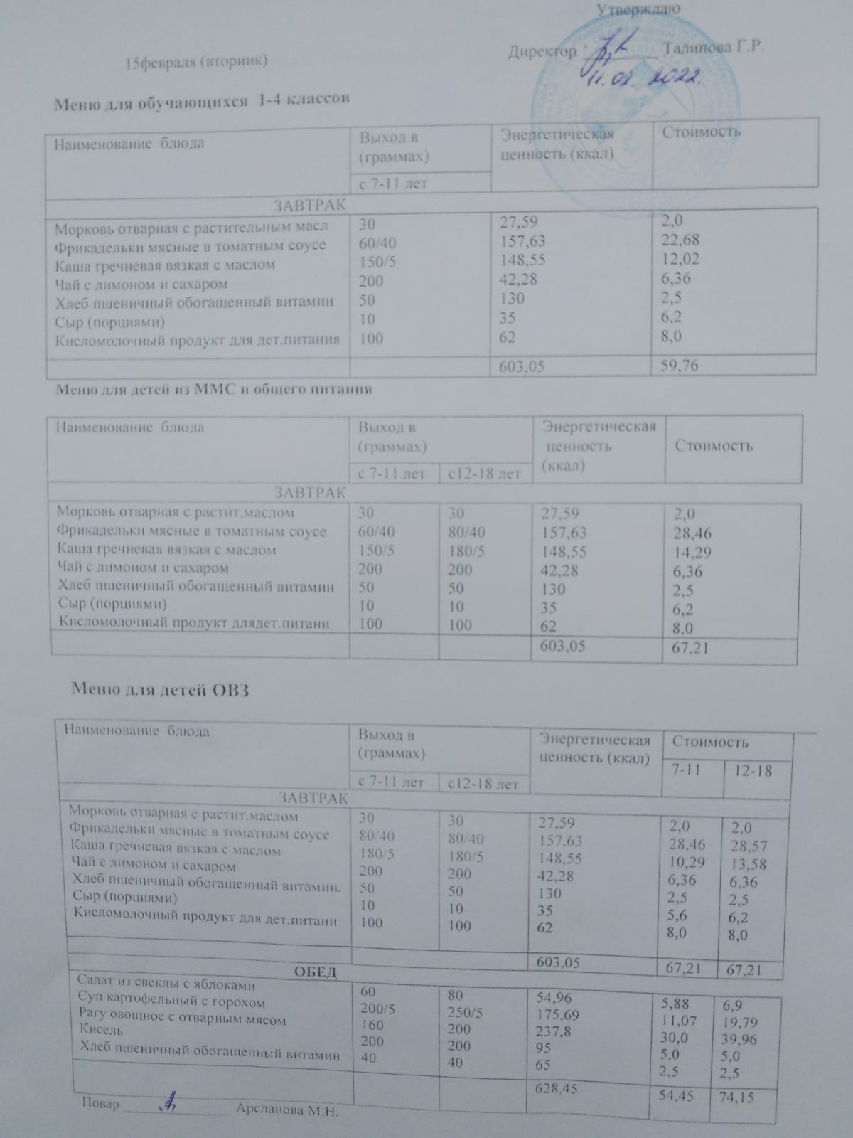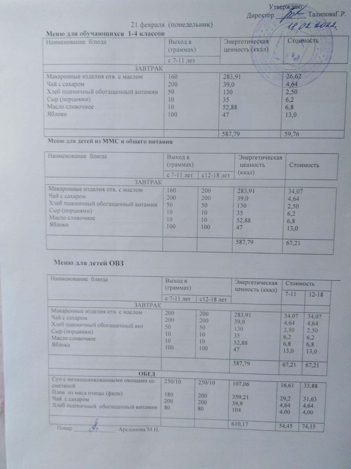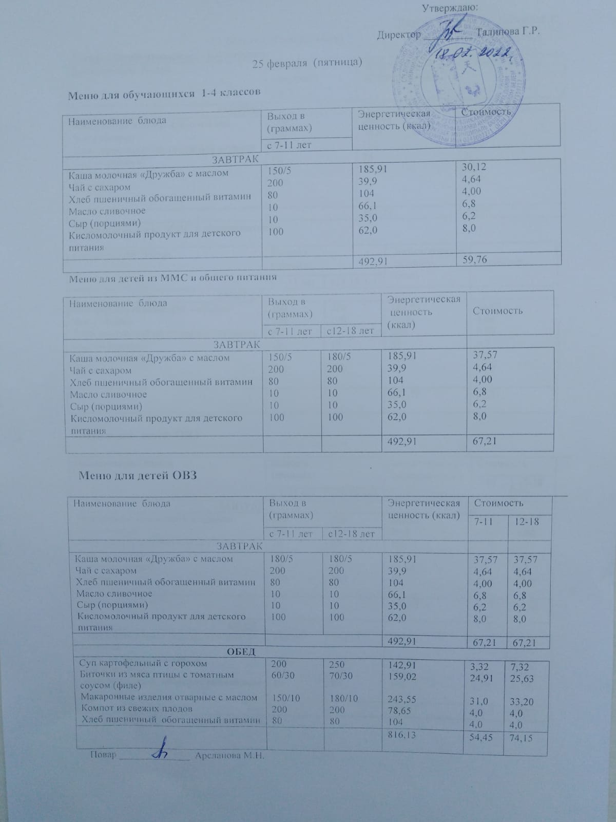 Стоимость школьного питания