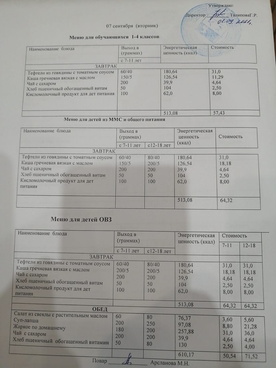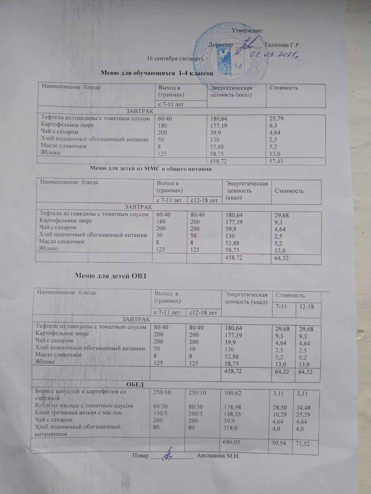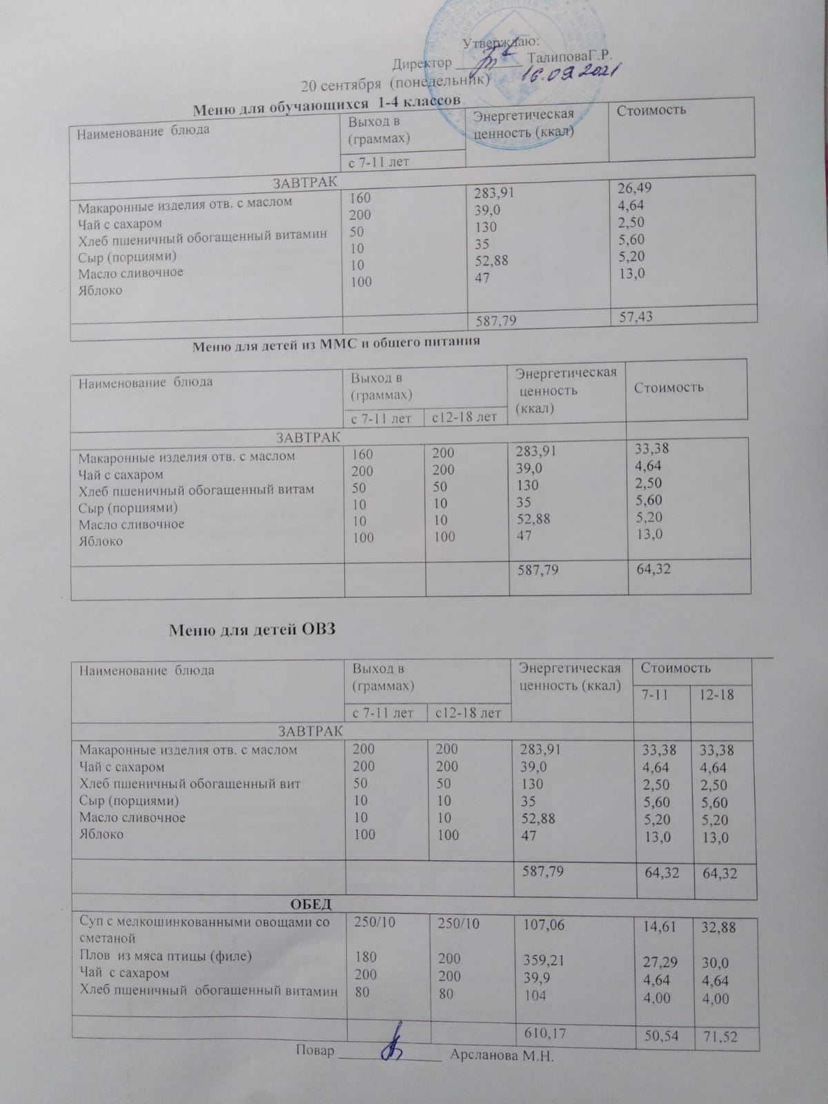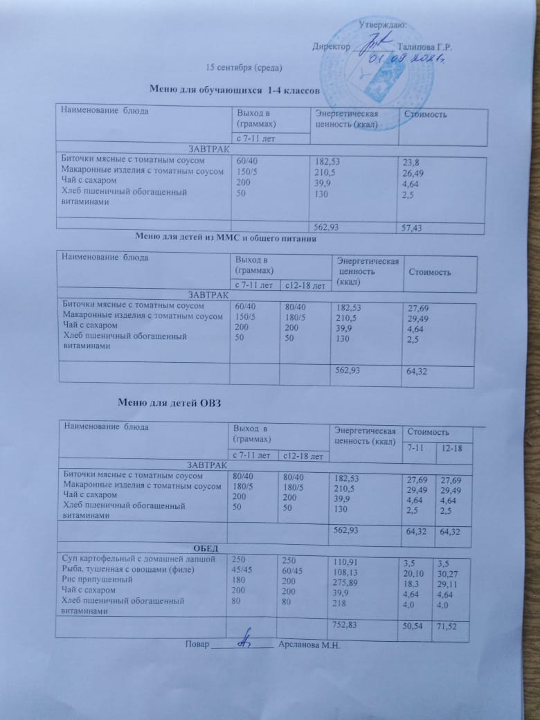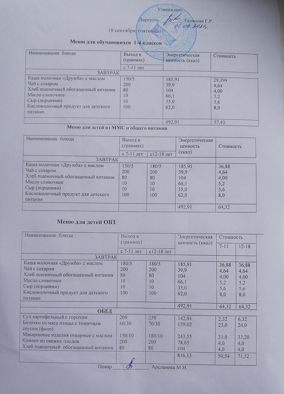 Стоимость школьного питания